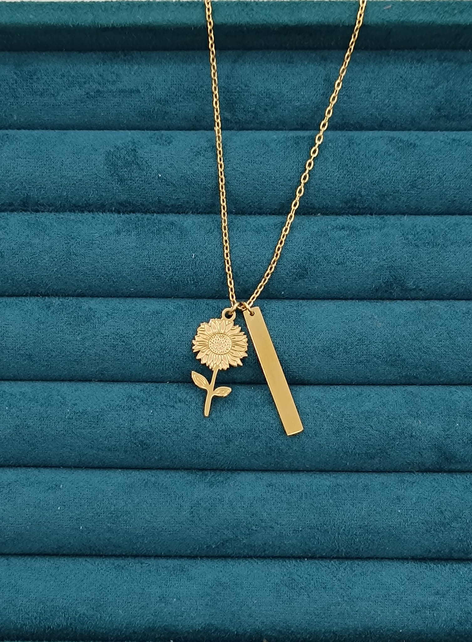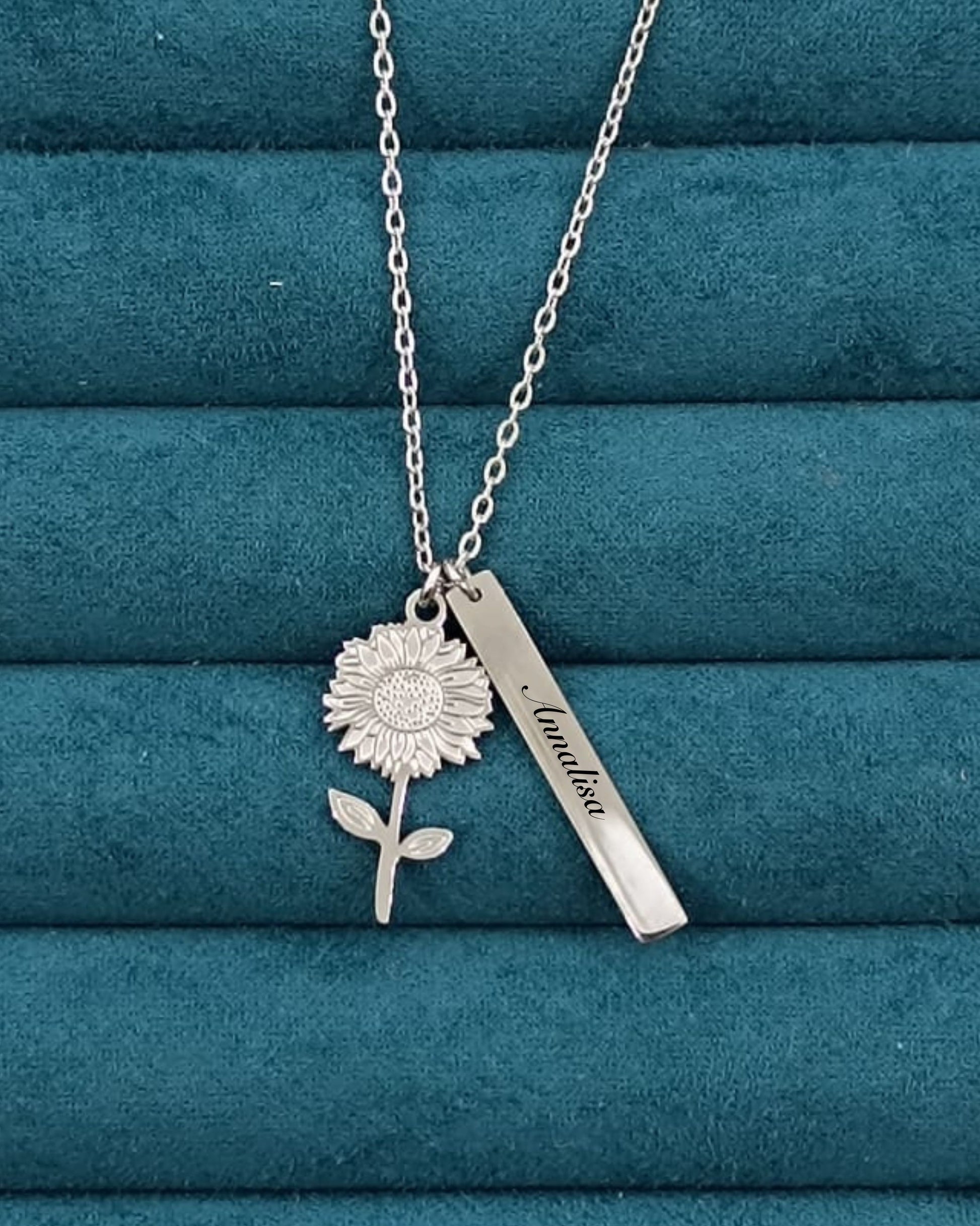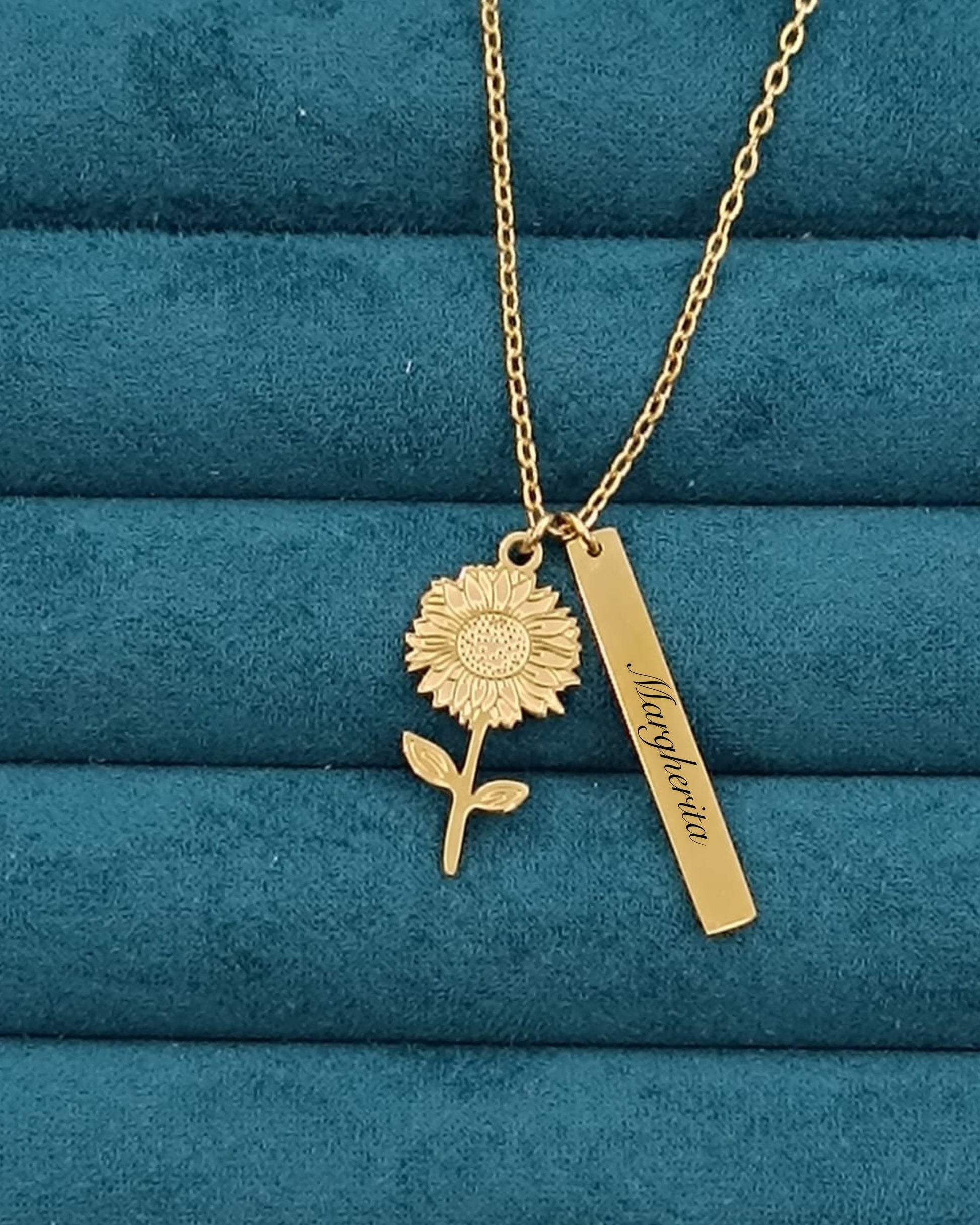 Collana con ciondolo a forma di margherita e un ciondolo prisma da personalizzare con incisione laser.