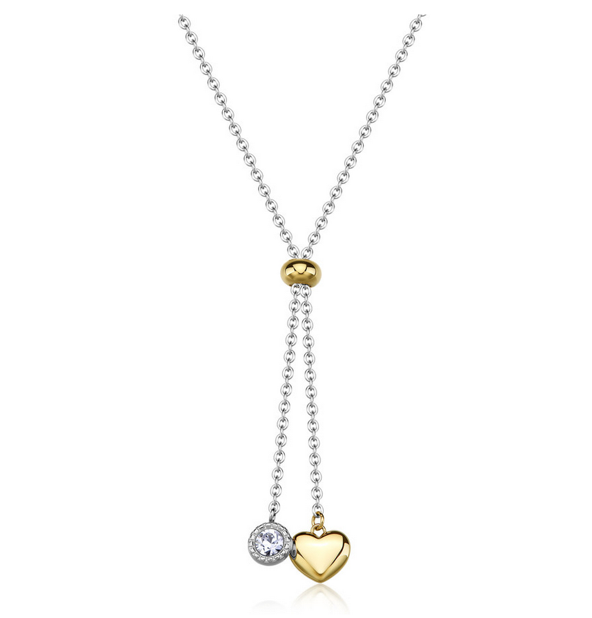 Collana a y in acciaio 316L e finitura pvd oro 14K con cuore e cristallo.