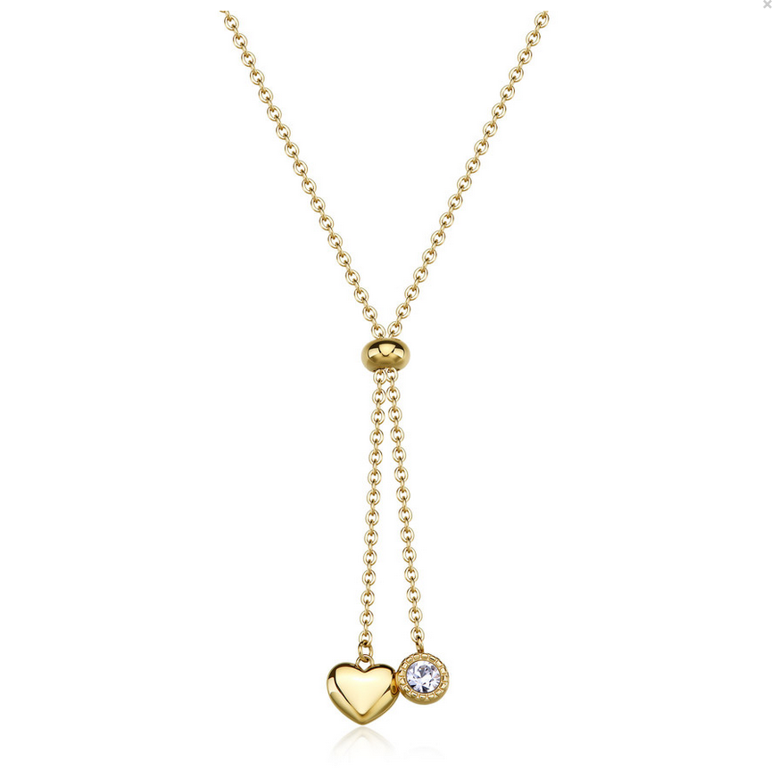 Collana a y in acciaio 316L e finitura pvd oro 14K con cuore e cristallo.