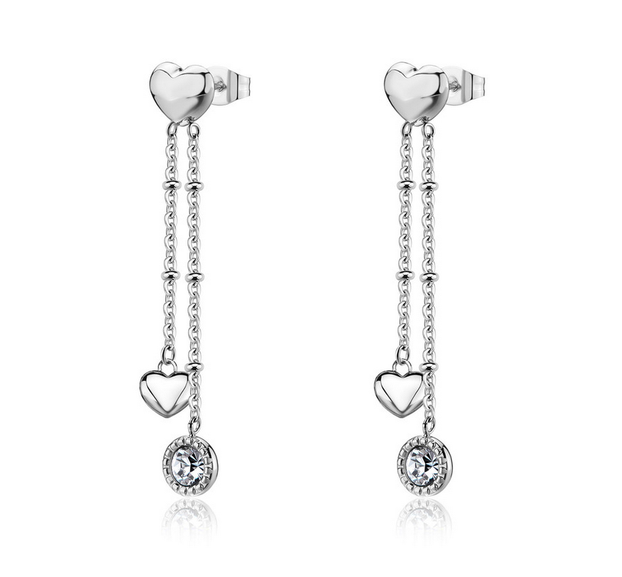 Orecchini pendenti in acciaio 316L con cuori e cristalli.