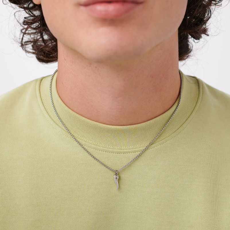 Collana in acciaio 316L con pendente a forma di cornetto e zirconi neri.