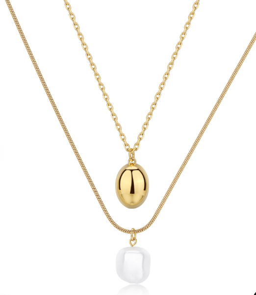 Collana a doppio filo in acciaio 316L e finitura pvd oro 14K con pendente ovale e perla di conchiglia centrale.